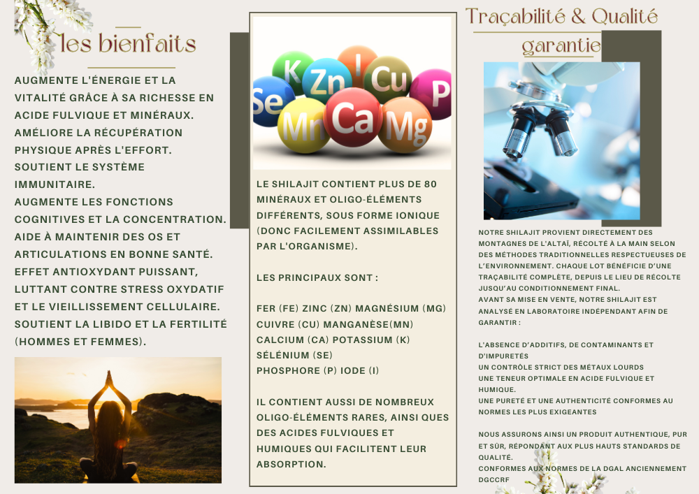 Je sais qu’il y a un certain nombre de minéraux, de métalloïdes et des oligo éléments mais j’aimerais avoir la liste des nutriments qui composent le shilajit, si possible.